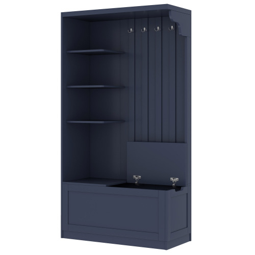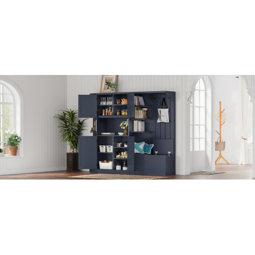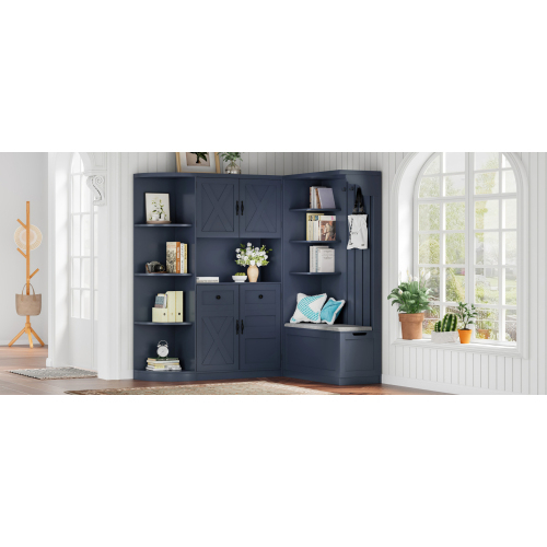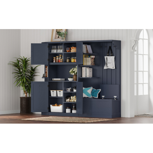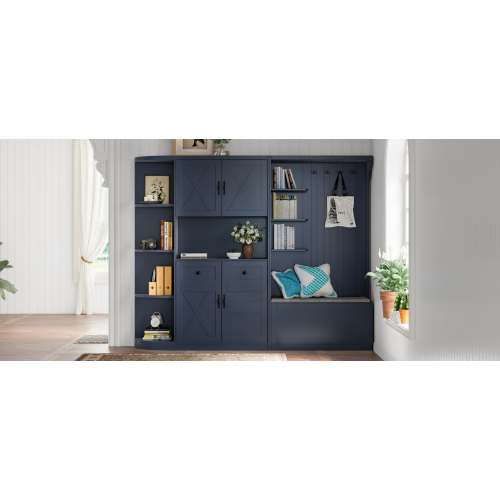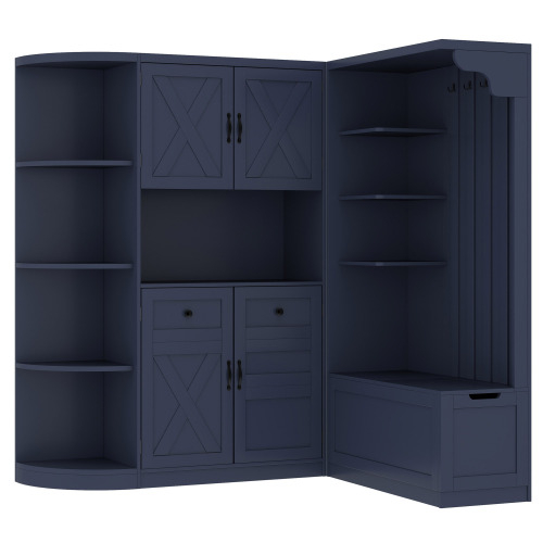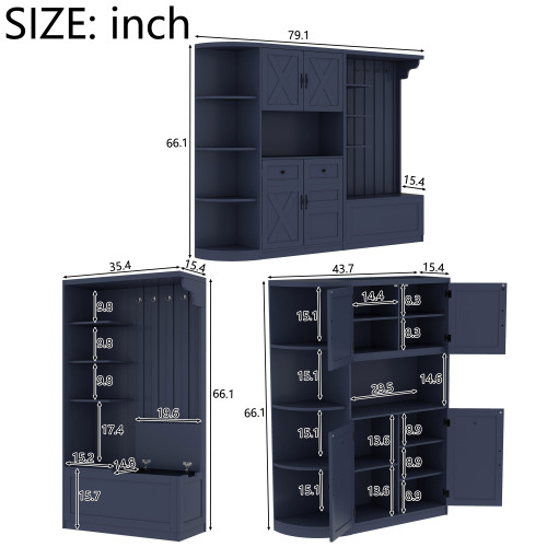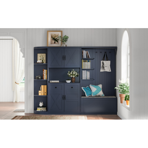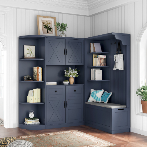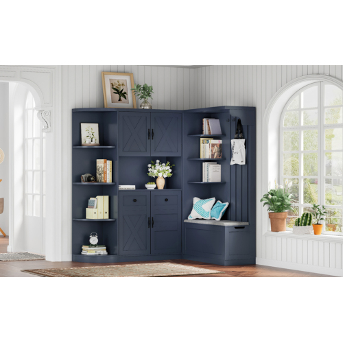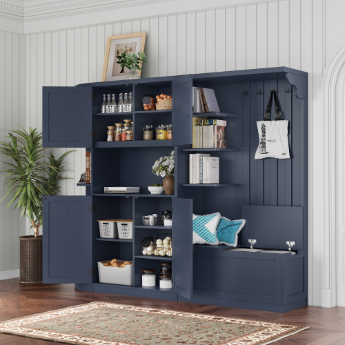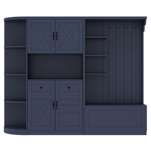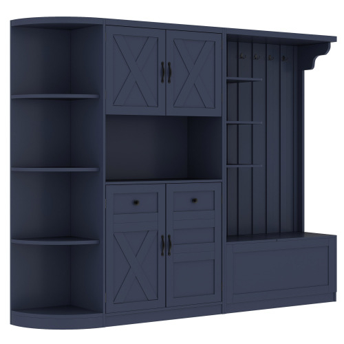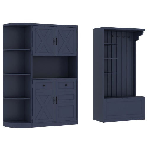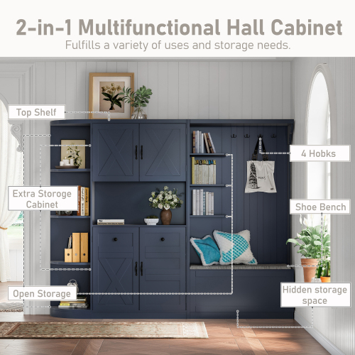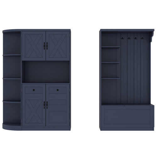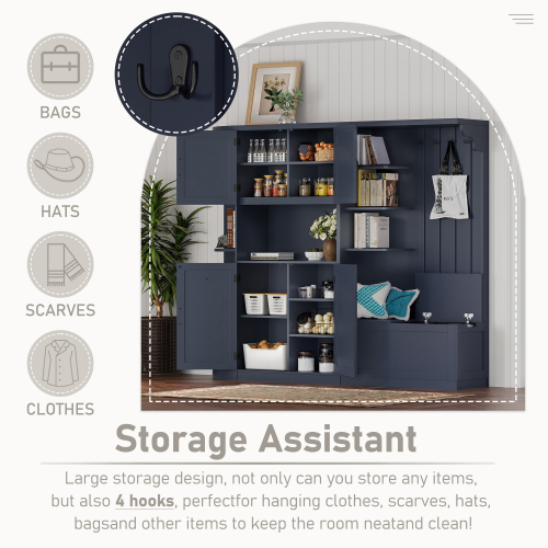 - [Ample Storage]The left and right hall cabinets can not only be used for storage, but also as a hall tree. The left cabinet has 5 open shelving areas and 2 cabinets on the top and bottom; the right cabinet has 3 open shelves and a flip hidden shelf, and also designed with 4 hooks to hang clothes and bags. It can hold different kinds of household items and keep the room clean and tidy.