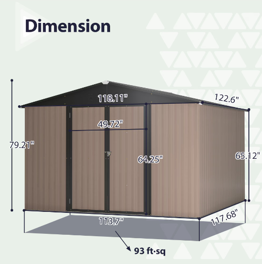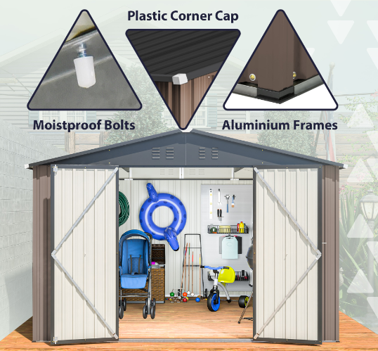 【Durable & Sturdy Outdoor Sheds Storage】- Storage Shed 10' x 10' . Durable construction with galvanized steel reinforcement makes this durable metal outdoor storage shed rustproof and UV-resistant. Overlapped wall panels features with waterproof and moister-resistant, worry-free for all weather condition use.